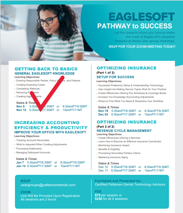 Patterson Technology Advisor Team presents a series of educational opportunities for Eaglesoft users to get indepth lessons remotely. Register today using the usergroup@pattersondental.com email to secure your position to learn more about your software and how it works for you! Please review flyer for dates and times available.